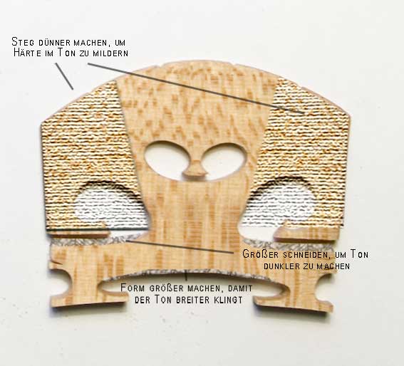 Die Dicke des Steges, seine Ausschnitte ,deren Größe und Form haben einen erhebliche Einfluß auf den Klang des Instrumentes. Hier ist viel Erfahrung gefragt, um den optimalen Steg für das Instrument herzustellen. Wenn Sie einen neuen Steg benötigen, weil der alte verzogen ist, sollten Sie ihren Geigenbauer bitten, den neuen Steg auf den gleichen Eigenton zu arbeiten.